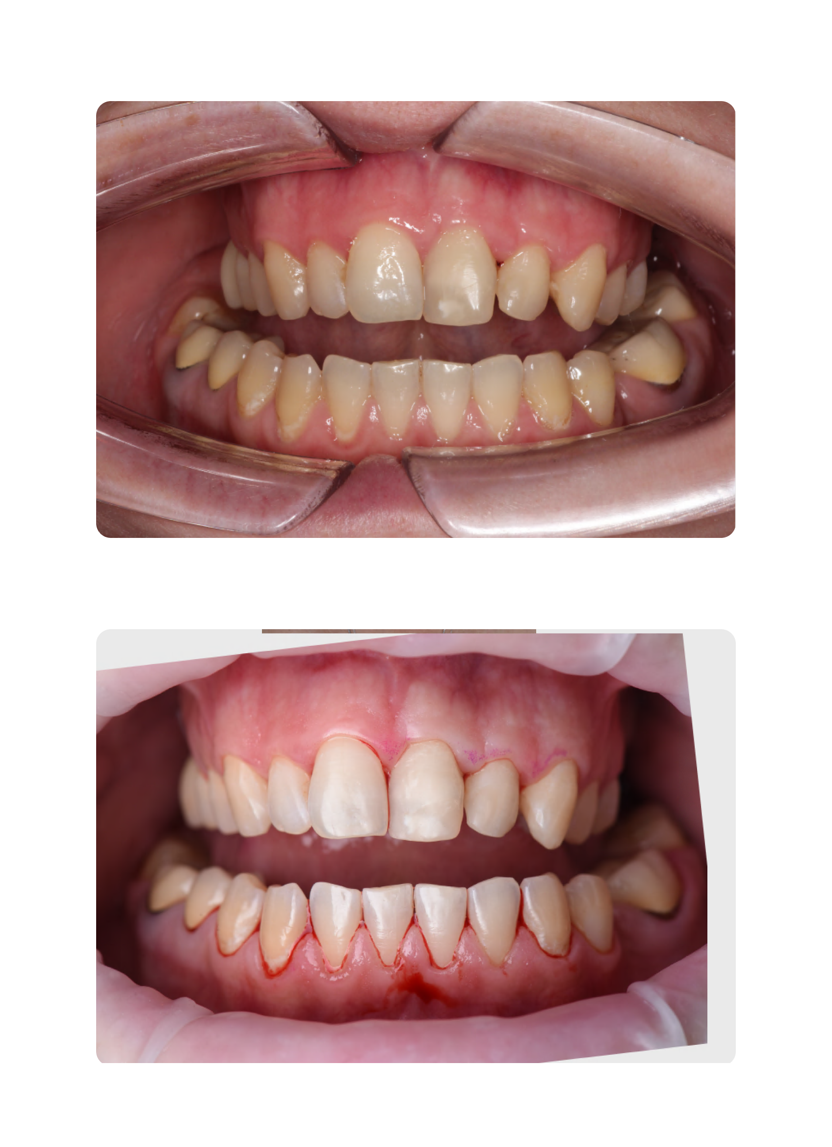 2. Процесс При первом посещении была проведена комплексная диагностика пациента, в которую входит: КТ, цифровое сканирование, виртуальная моделировка будущих зубов и улыбки, диагностика функциональных аспектов зубочелюстной систем, планирование навигационных хирургических шаблонов. Следующим этапом было удаление зубов, установка имплантата в концепции All-on-4 по системе NEODENT, снятие оттисков и примерка цифрового макета (прототип будущих зубов и улыбки). На этапе адаптации она могла в любой день обратиться в клинику за консультацией.